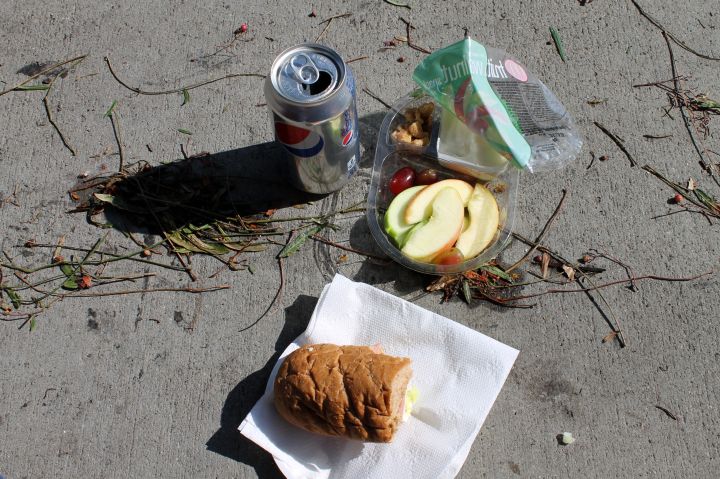 Someone threw their partially-eaten donut in the smoking grit. Really? The trash can is 10 feet away.