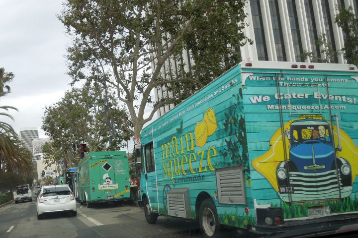 Tons of food trucks along Wilshire.
