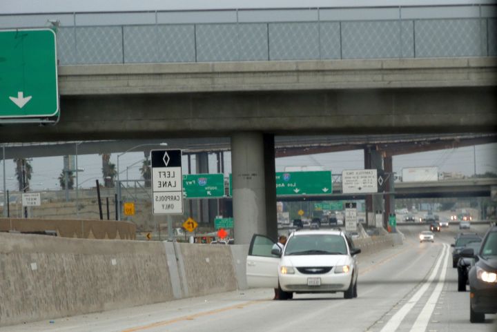 This guy broke down in the carpool lane. Considering how fast you're going, you'd think you'd have plenty of momentum to get across the lanes to the shoulder, or even pull over to the left shoulder. Why would you ever stop right in the middle of the lane?