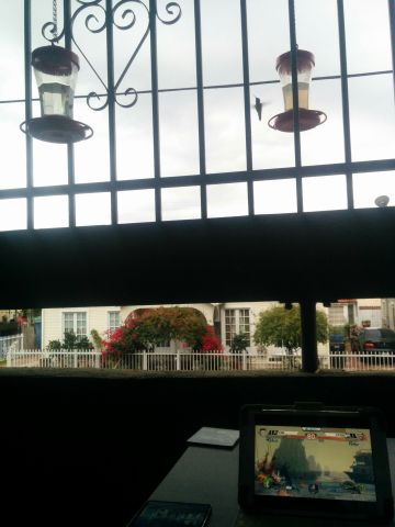 Enjoying our balcony by watching hummingbirds along with the EVO 2015 fighting game championships.