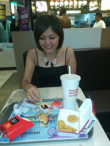 Grabbing a quick bite at McDonald's in a less-than-great neighborhood. We're a little overdressed; Ogii is in a nice dress and the guy behind her ordering has no shirt. Which I'm pretty sure is a health code violation.