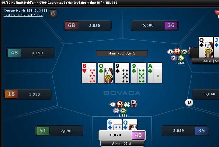 And I"m pretty much out of the tournament already. I called a turn raise with the nut flush draw and shoved on the river to represent that I had it, but he called. I guess he had the third nuts, so pretty hard for him to fold there. I should have not bet the turn and folded the river instead and I would have lost some chips but still had plenty left.