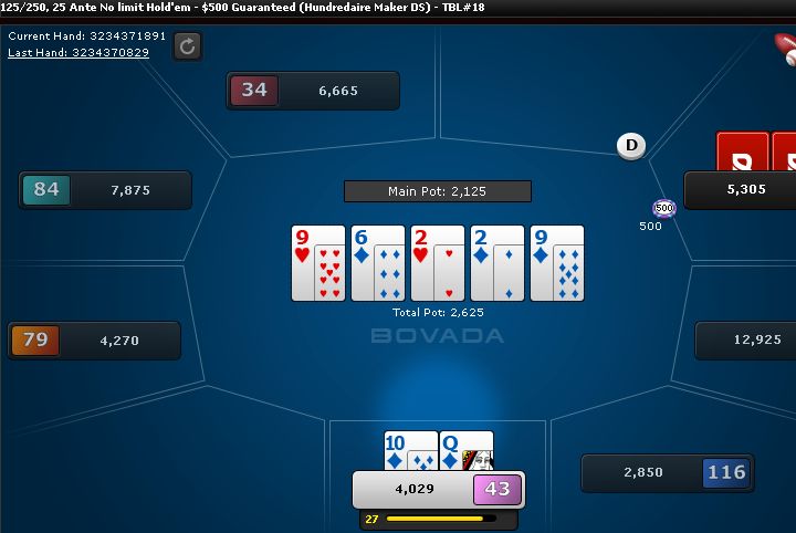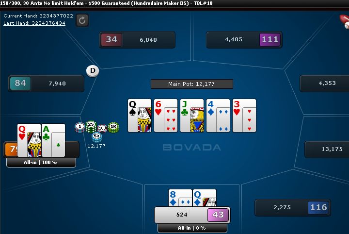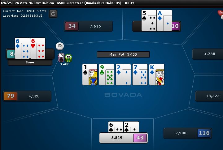 I bluffed the river and he called. I really need to stop bluffing rivers when there is two pair on the board because A-high hands often call.