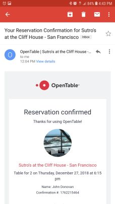 Ooh, did Ogii secretly reserve a table at the Cliff House up in San Francisco and accidentally send it to my email? Aw, nope; just some guy who put his email in incorrectly when he made his reservation.