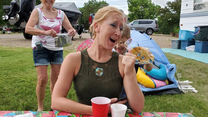 At the campsite and being attacked by kids with water guns.