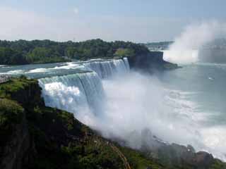 The view of the falls from the US side. On the left are the American Falls; on the right are the horseshoe falls.