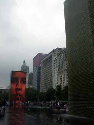Memorial Park had a ton of really neat artwork. This is the Crown Fountain. Images show up in the two giant pillars on each end, and kids run around in the water between them.