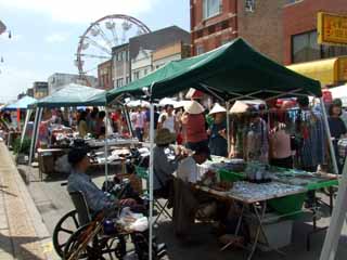 The Chinatown summer fair was on that Sunday. There were only a few food booths, though; mostly it was selling other items. And of course all the silly white people bought and wore the stereotypical Chinese hat.