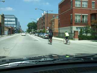 A lot of Chicago roads have bike paths on the side, which is nice. However, the path goes away at intersections, so there's still a problem there with bikes having to jam up against traffic.